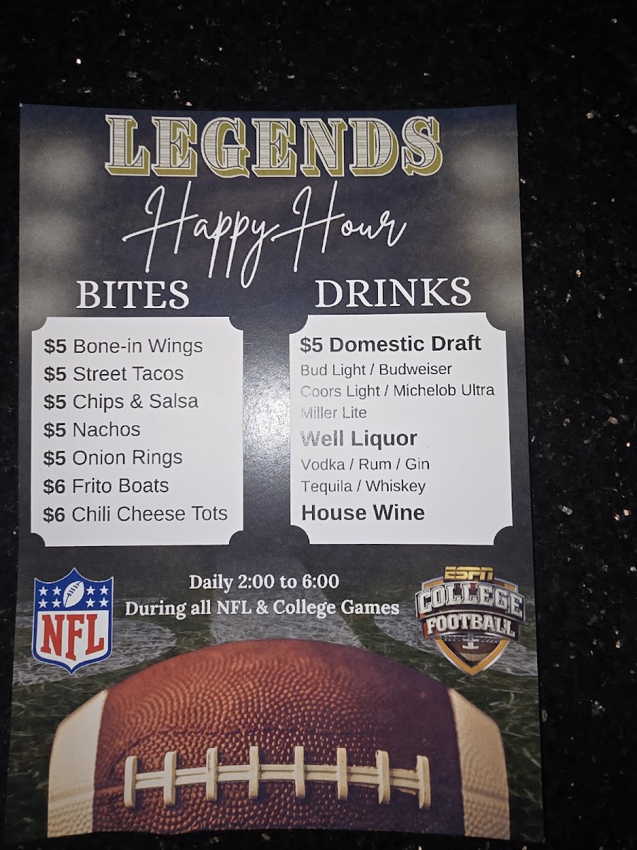 The atmosphere at Legends is welcoming and easy going, so the food and drinks naturally complement casual gatherings and everyday celebrations. From a midday bite to an evening out, the menu enhances moments where good company and simple, enjoyable flavors come together.